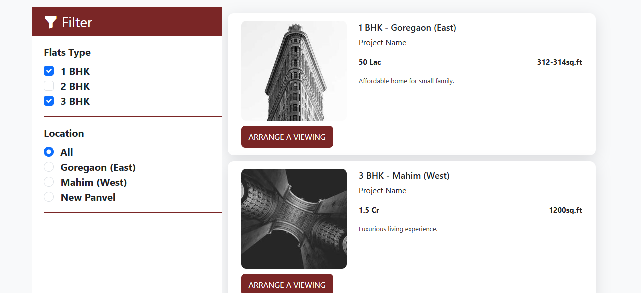 A dynamic property listing platform built using HTML, CSS, and JavaScript with intelligent filtering options for flat type and location. Fully responsive layout with modern UI and instant filter results for a seamless user experience